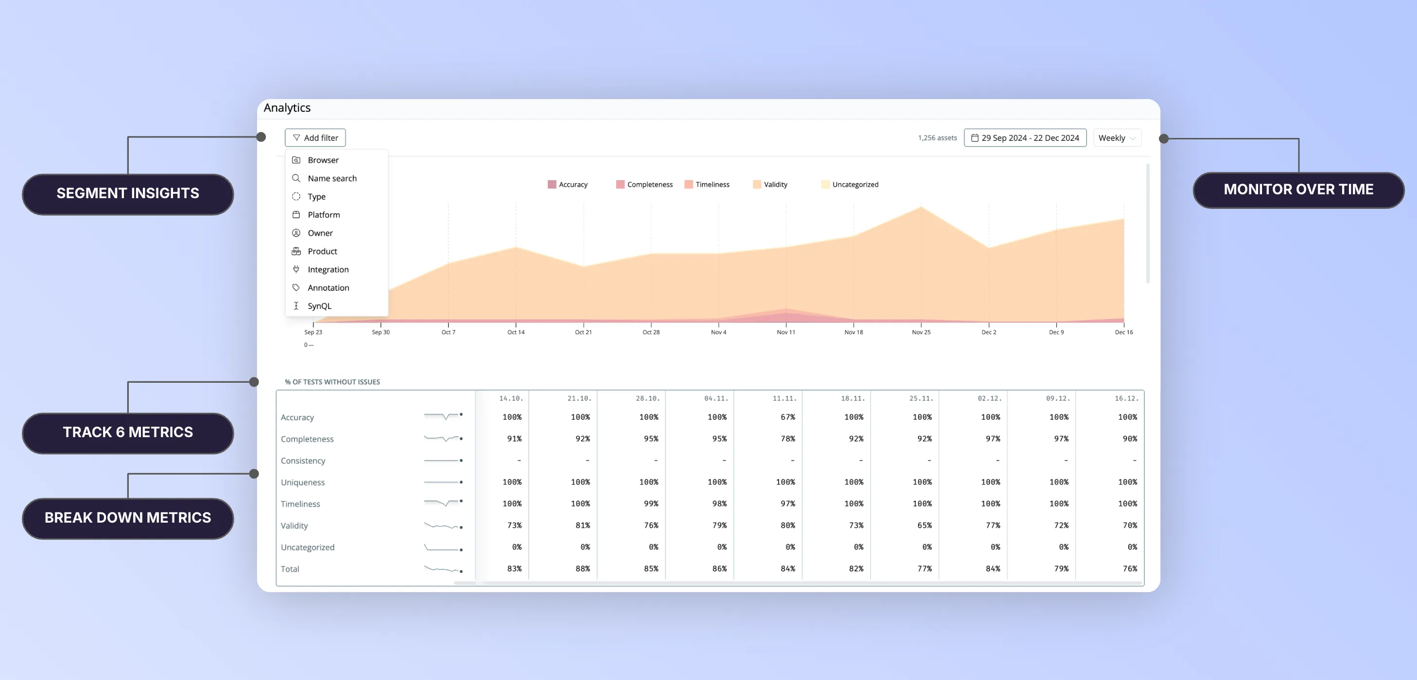 To help teams be more systemic about how they think of data quality, we shipped Data Quality Analytics. This lets you track the key performance of your data stack across metrics such as the number of tests, the number of tests with issues, the number of incidents, and new versus resolved issues. Insights can be broken down into segments such as Owner, Data Product, and Platform and monitored over time to drive accountability.
