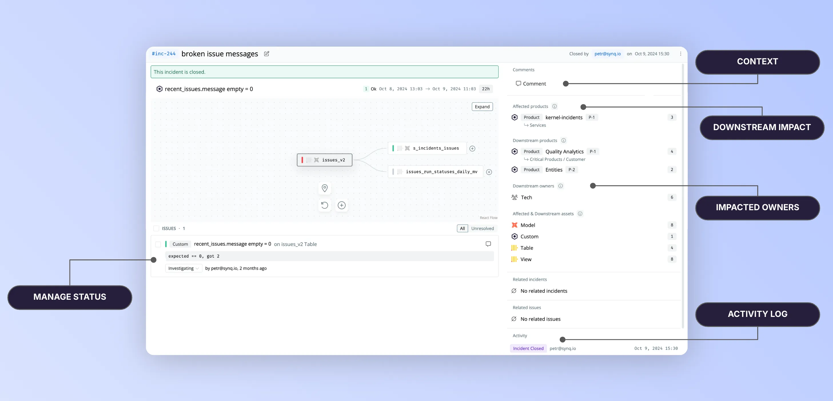 “Before SYNQ, we didn’t declare incidents in the data team, which could create an overwhelming feeling that important issues would get lost in the noise. Now we’re more organized. Important issues are declared as incidents and closed when the root cause has been fixed. We can see downstream impacted products and owners, and the activity log highlights who’s working on what.” – Aiven
