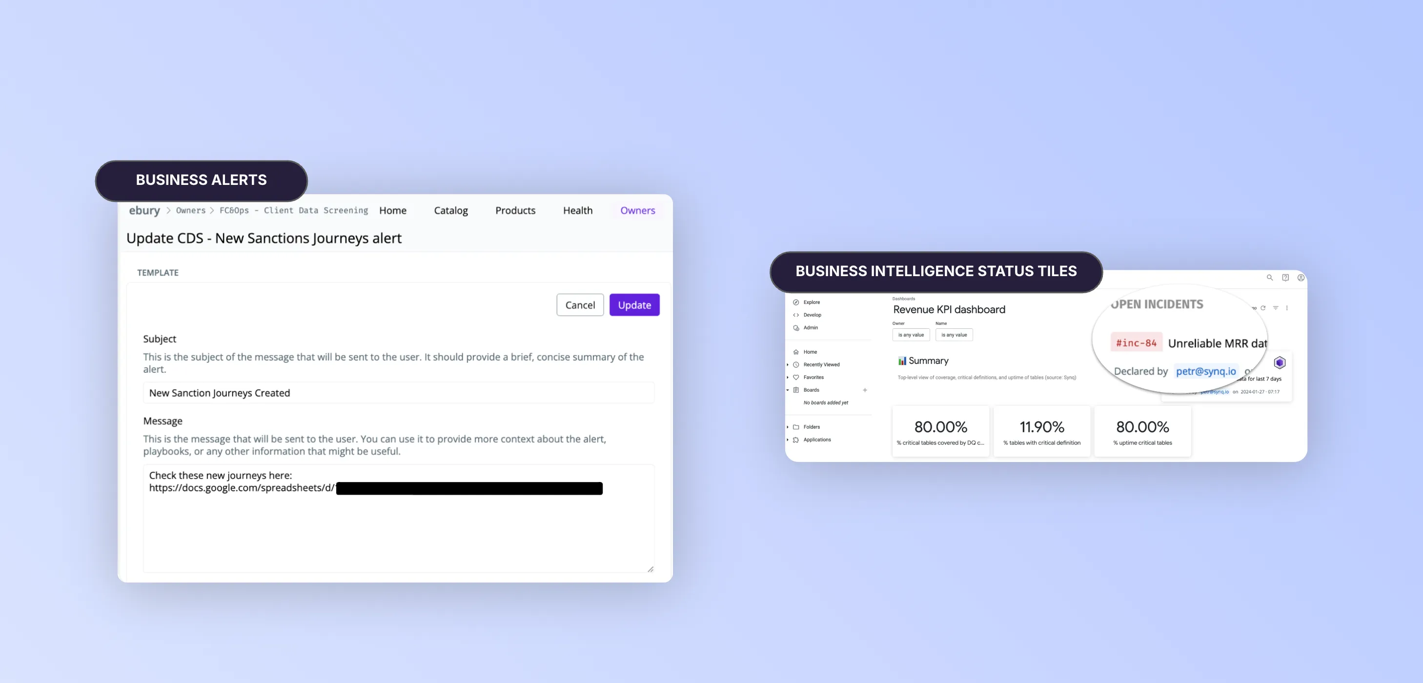 There’s no one-fix-all solution to this problem but we’ve shipped a few features we’ve already seen have an impact: Business alerts – customize the message for alerts so that non-technical stakeholders can act on them and BI status tiles – show directly in your BI tool if there are any known issues on or upstream of it.