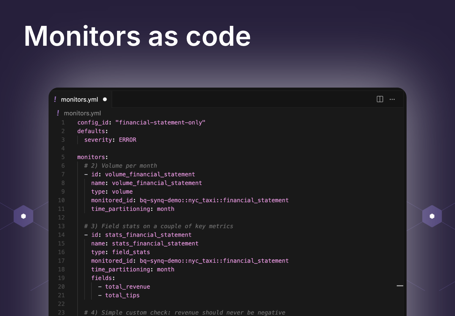 You can now manage SYNQ monitors through YAML code, managed in your environment. Specify which tables should have what monitors, and codify custom monitors directly in SQL. You can mix monitors as code with monitors and deployment rules defined in the SYNQ UI to match workflows that work across your entire team.