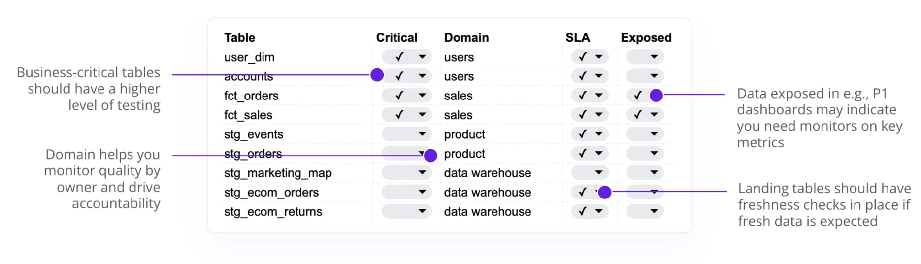 In most scenarios, you want to specify expectations depending on how data is used. We recommend doing this as you may not want to hold all assets accountable to the same standards. In the same way, as you may only enforce documentation on ‘gold’ assets, the data governance team should play the role of setting guidelines for expectations for the testing of data. Keeping in mind what data is business-critical, what’s being exposed (e.g., in a dashboard), and what assets should have an SLA (e.g., if data doesn’t arrive on time, there are downstream ramifications) helps you assess which checks you need and thus measure what matters.