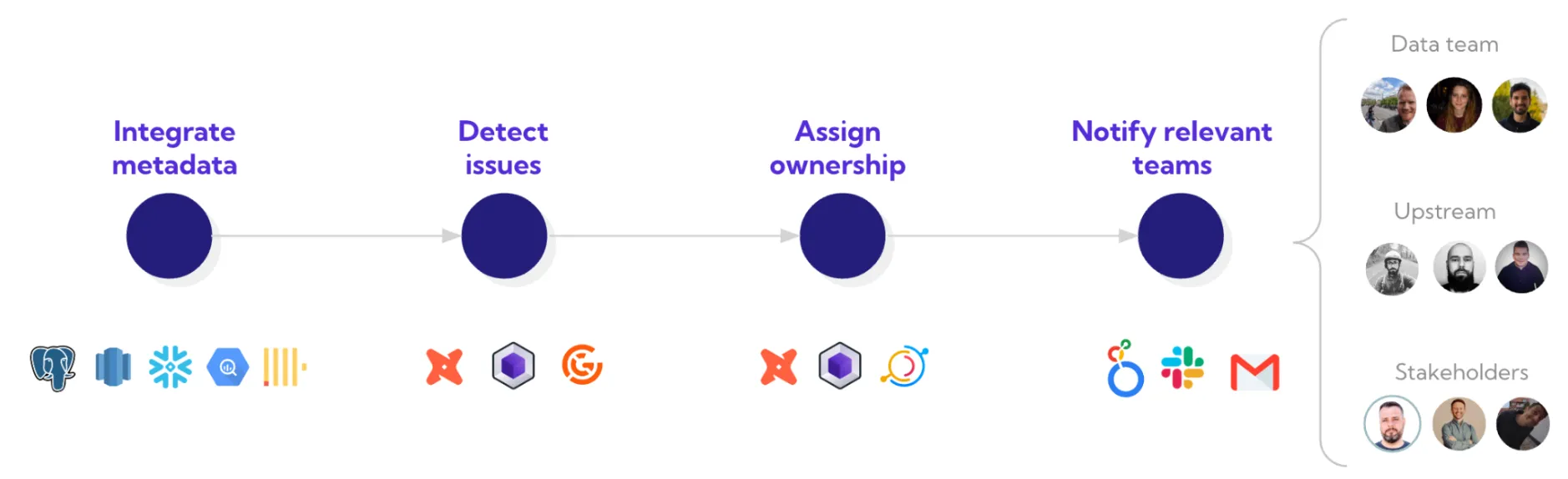 The data governance teams are ultimately responsible for building a consistent ownership model with clearly defined roles and responsibilities. Breaking it into steps makes it clearer where you have gaps: (1) consolidate your metadata, (2) detect issues with relevant tests, (3) assign ownership, and (4) notify the relevant people of issues in a way where they can take action.