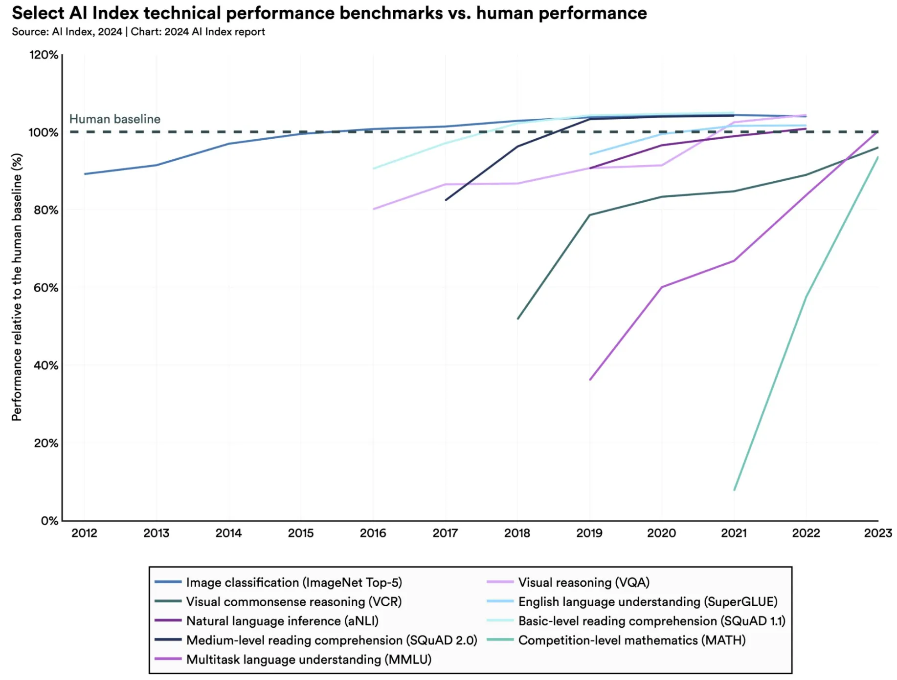 AI is getting good. Really good, in fact. Stanford’s 2024 AI Index Report shows that AI has surpassed human performance on several benchmarks, including some in image classification, visual reasoning, and English understanding.